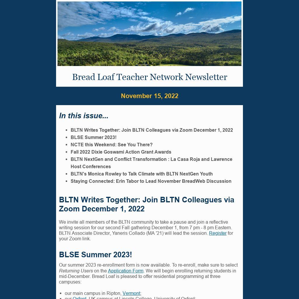 If you'll be at NCTE, stop by the Bread Loaf table in the Exhibit Hall to see Gillian Zieger from the BLSE office. Contact Tom McKenna if you'd like to be part of a BLTN group text to find one another in Anaheim. Here is information on the sessions that will be given by BLTN's Dr. Kayla Hostetler, Dr. Ashlynn Wittchow (MA '18), and Dani Sorrels.