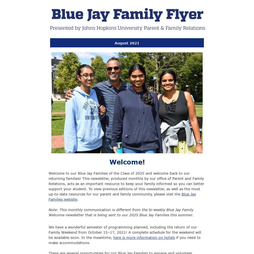 Welcome to our Blue Jay Families of the Class of 2025 and welcome back to our returning families! This newsletter, produced monthly by our office of Parent and Family Relations, acts as an important resource to keep your family informed so you can better support your student. To view previous editions of this newsletter, as well as the most up-to-date resources for our parent and family community, please visit the Blue Jay Families website.