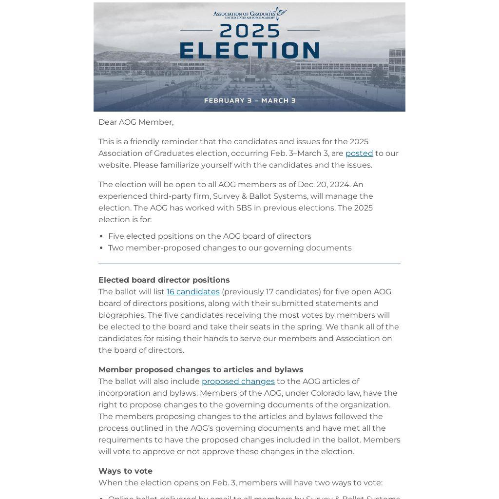 The ballot will also include proposed changes to the AOG articles of incorporation and bylaws. Members of the AOG, under Colorado law, have the right to propose changes to the governing documents of the organization. The members proposing changes to the articles and bylaws followed the process outlined in the AOG’s governing documents and have met all the requirements to have the proposed changes included in the ballot. Members will vote to approve or not approve these changes in the election.