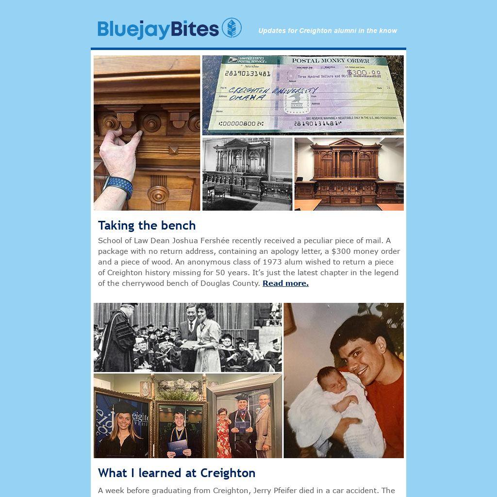 School of Law Dean Joshua Fershée recently received a peculiar piece of mail. A package with no return address, containing an apology letter, a $300 money order and a piece of wood. An anonymous class of 1973 alum wished to return a piece of Creighton history missing for 50 years. It’s just the latest chapter in the legend of the cherrywood bench of Douglas County. Read more.