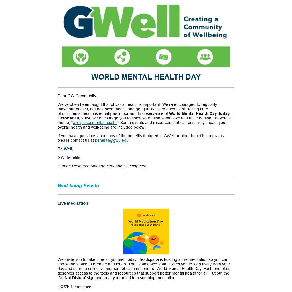 As a reminder, through your employee benefits, you have access to the GW Employee Assistance Program for free, 24/7 confidential counseling for any emotional health concerns as well as Headspace, an app that provides mindfulness support. Employees enrolled in GW medical plans have access to behavioral health benefits as well as virtual therapy support.