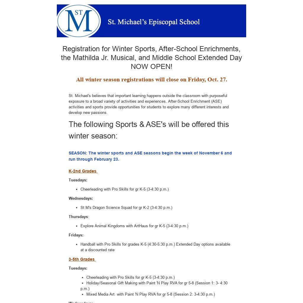 St. Michael's believes that important learning happens outside the classroom with purposeful exposure to a broad variety of activities and experiences. After-School Enrichment (ASE) activities and sports provide opportunities for students to explore many different interests and develop new passions.