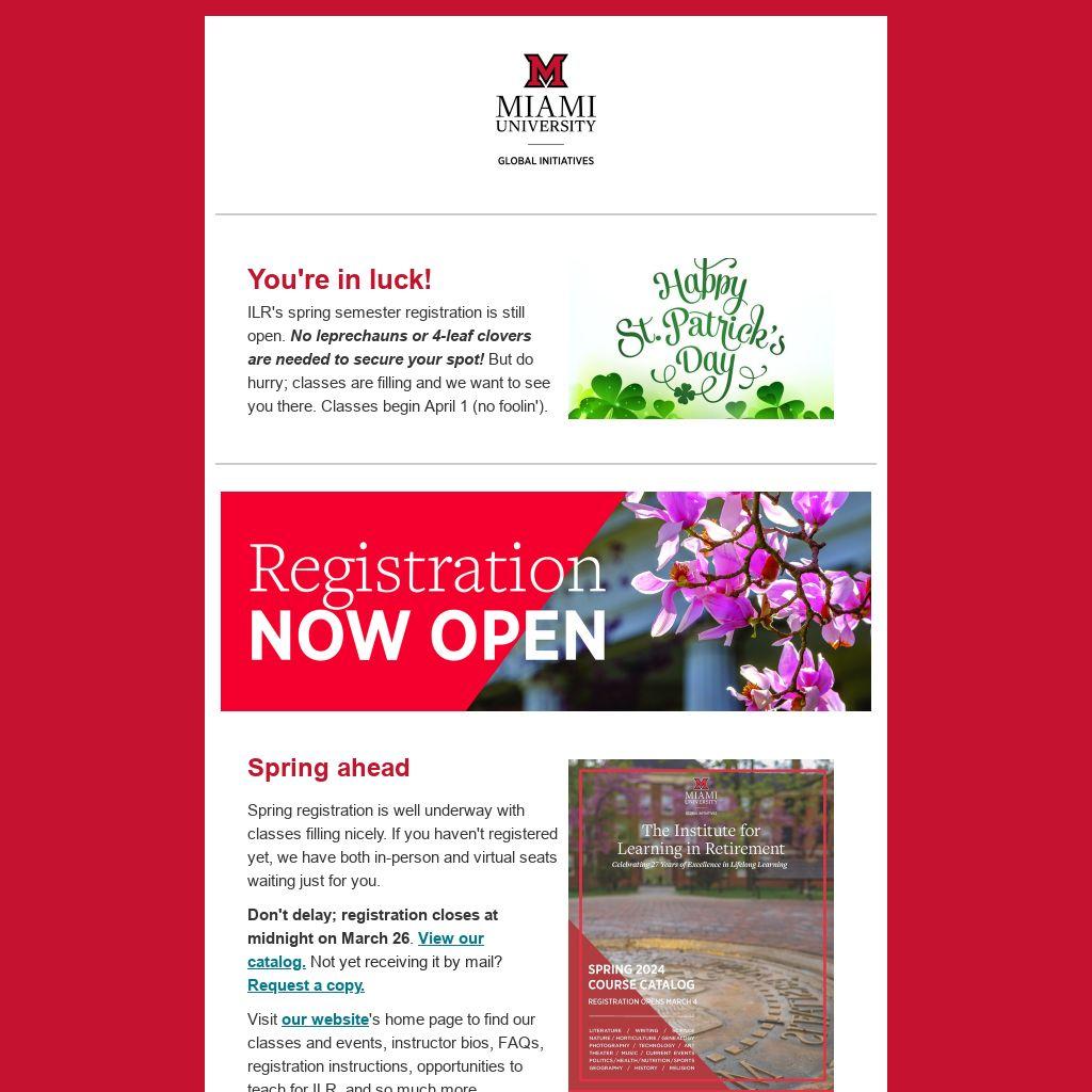 You're in luck!ILR's spring semester registration is still open. No leprechauns or 4-leaf clovers are needed to secure your spot! But do hurry; classes are filling and we want to see you there. Classes begin April 1 (no foolin').
