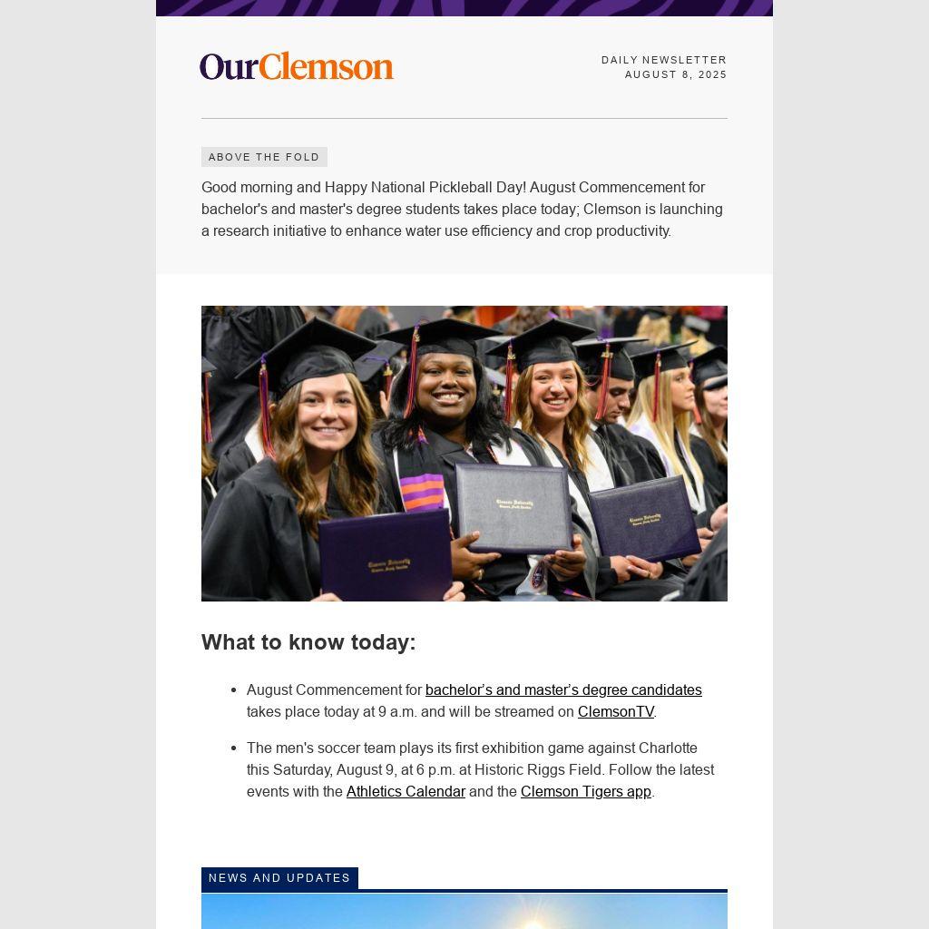 Good morning and Happy National Pickleball Day! August Commencement for bachelor's and master's degree students takes place today; Clemson is launching a research initiative to enhance water use efficiency and crop productivity.