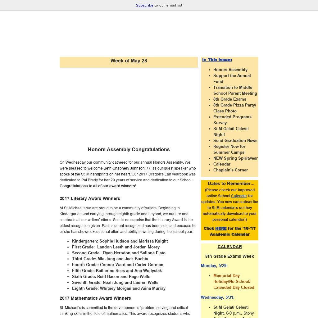 On Wednesday our community gathered for our annual Honors Assembly. We were pleased to welcome Beth Ghaphery Johnson '77 as our guest speaker who spoke of the St. M handprints on her heart. Our 2017 Dragon's Lair yearbook was dedicated to Pat Brady for her 29 years of service and dedication to our School. Congratulations to all of our award winners!
