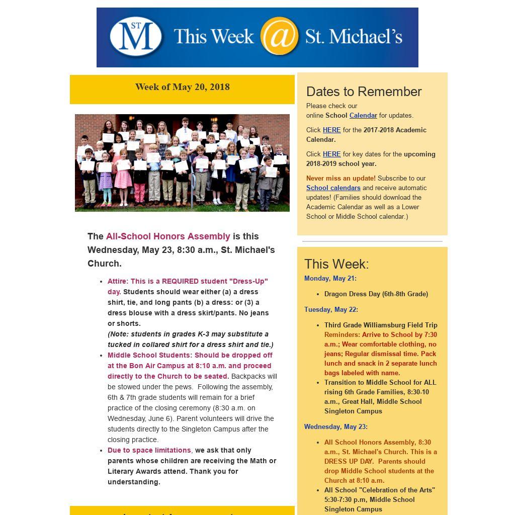 Wednesday, May 23: - All School Honors Assembly, 8:30 a.m., St. Michael's Church. This is a DRESS UP DAY. Parents should drop Middle School students at the Church at 8:10 a.m.