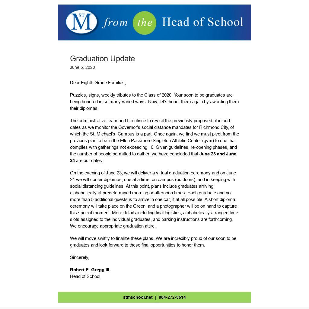 The administrative team and I continue to revisit the previously proposed plan and dates as we monitor the Governor’s social distance mandates for Richmond City, of which the St. Michael’s Campus is a part. Once again, we find we must pivot from the previous plan to be in the Ellen Passmore Singleton Athletic Center (gym) to one that complies with gatherings not exceeding 10. Given guidelines, re-opening phases, and the number of people permitted to gather, we have concluded that June 23 and June 24 are our dates.