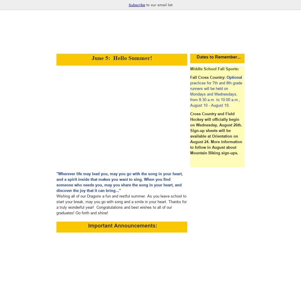 This will be our final newsletter of this school year. We will start resume again in mid-August. Of course, any pertinent information that needs to be shared with our families will be emailed out this summer.