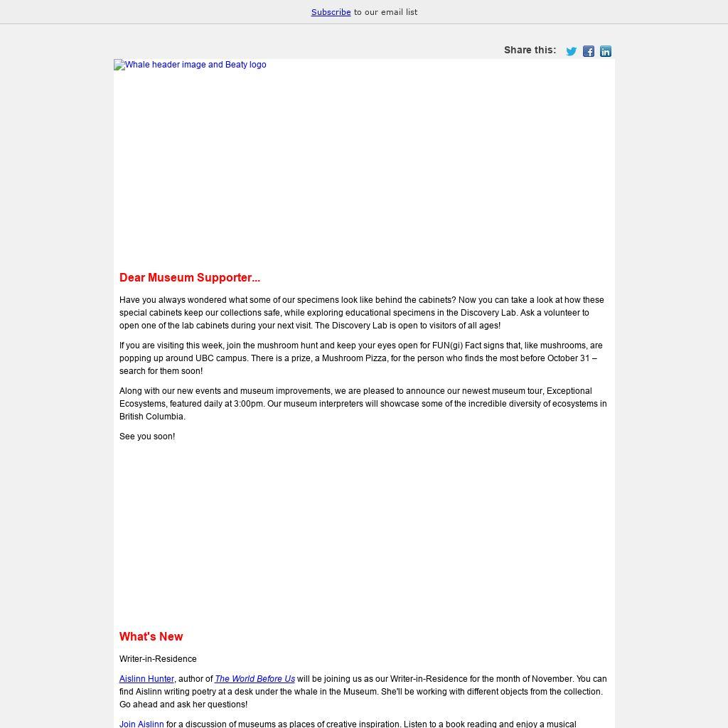 Have you always wondered what some of our specimens look like behind the cabinets? Now you can take a look at how these special cabinets keep our collections safe, while exploring educational specimens in the Discovery Lab. Ask a volunteer to open one of the lab cabinets during your next visit. The Discovery Lab is open to visitors of all ages! If you are visiting this week, join the mushroom hunt and keep your eyes open for FUN(gi) Fact signs that, like mushrooms, are popping up around UBC campus. There is a prize, a Mushroom Pizza, for the person who finds the most before October 31 – search for them soon! Along with our new events and museum improvements, we are pleased to announce our newest museum tour, Exceptional Ecosystems, featured daily at 3:00pm. Our museum interpreters will showcase some of the incredible diversity of ecosystems in British Columbia. See you soon!