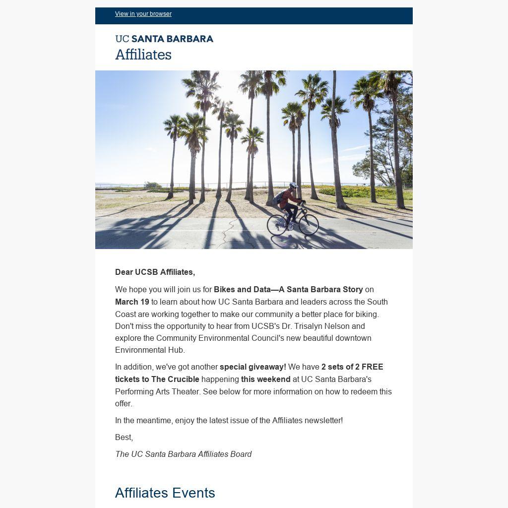 We hope you will join us for Bikes and Data—A Santa Barbara Story on March 19 to learn about how UC Santa Barbara and leaders across the South Coast are working together to make our community a better place for biking. Don't miss the opportunity to hear from UCSB's Dr. Trisalyn Nelson and explore the Community Environmental Council's new beautiful downtown Environmental Hub.