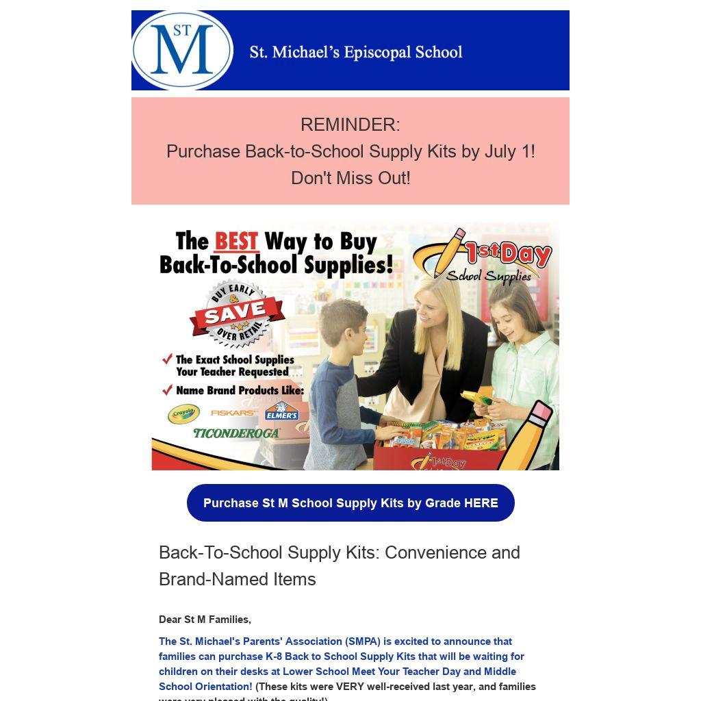 The St. Michael's Parents' Association (SMPA) is excited to announce that families can purchase K-8 Back to School Supply Kits that will be waiting for children on their desks at Lower School Meet Your Teacher Day and Middle School Orientation! (These kits were VERY well-received last year, and families were very pleased with the quality!)