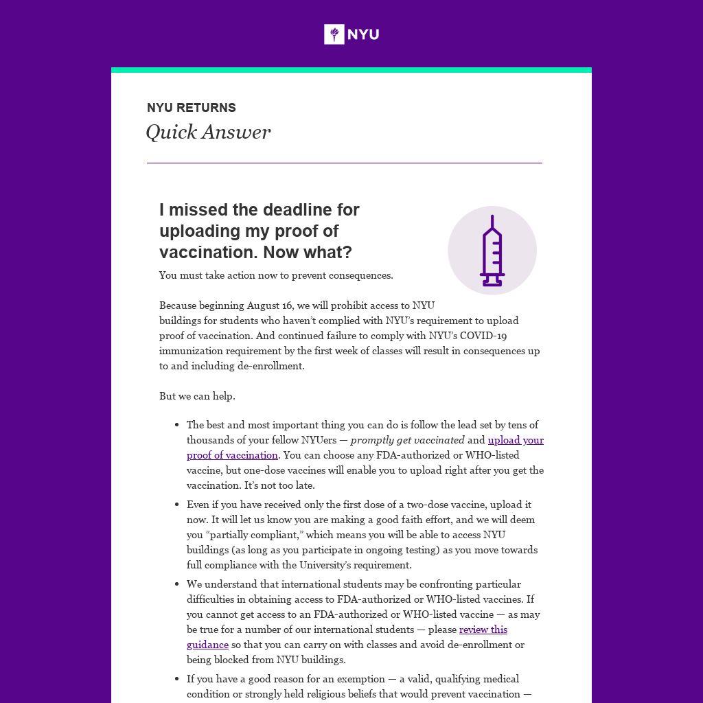 Because beginning August 16, we will prohibit access to NYU buildings for students who haven’t complied with NYU’s requirement to upload proof of vaccination. And continued failure to comply with NYU’s COVID-19 immunization requirement by the first week of classes will result in consequences up to and including de-enrollment.