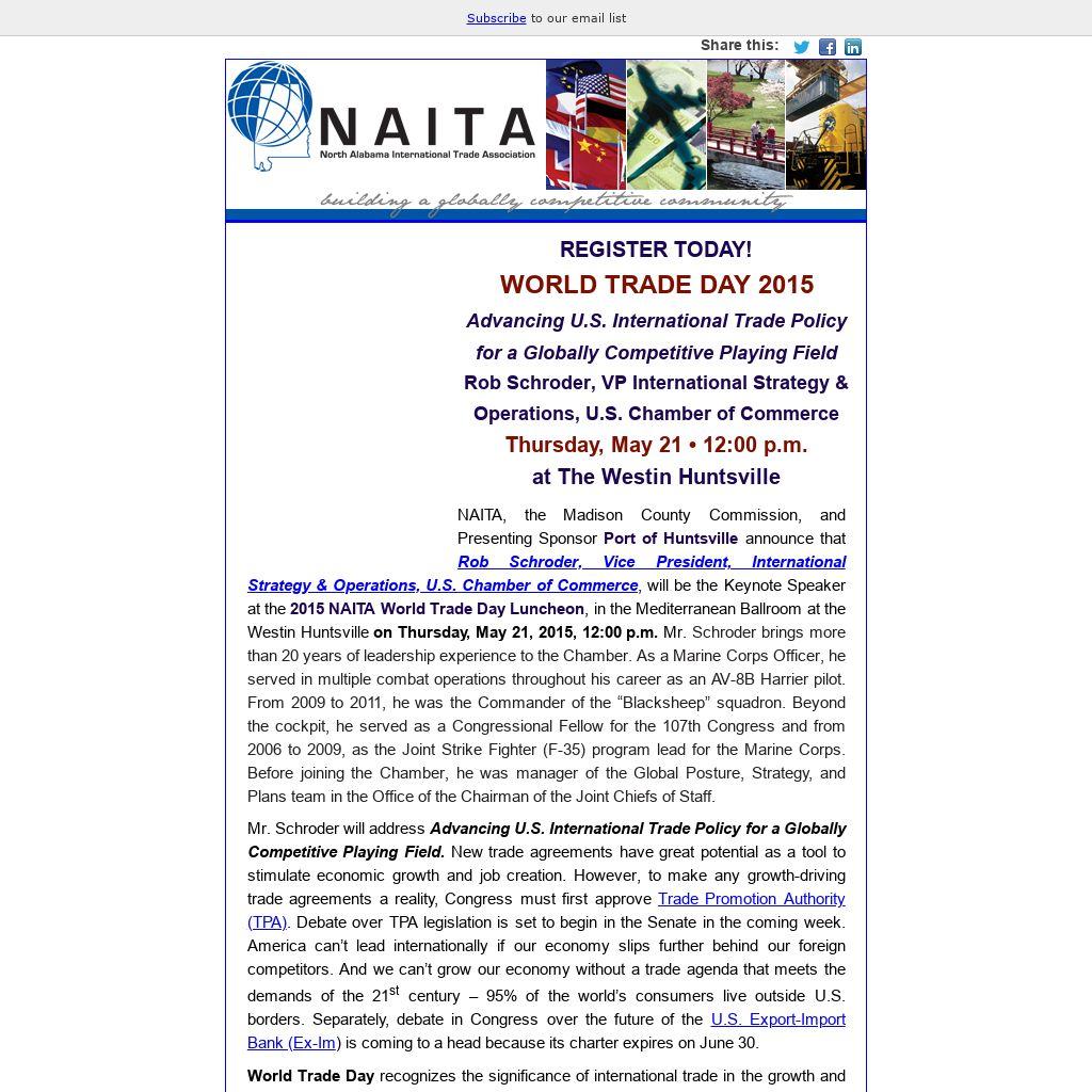 at The Westin Huntsville NAITA, the Madison County Commission, and Presenting Sponsor Port of Huntsville announce that Rob Schroder, Vice President, International Strategy & Operations, U.S. Chamber of Commerce, will be the Keynote Speaker at the 2015 NAITA World Trade Day Luncheon, in the Mediterranean Ballroom at the Westin Huntsville on Thursday, May 21, 2015, 12:00 p.m. Mr. Schroder brings more than 20 years of leadership experience to the Chamber. As a Marine Corps Officer, he served in multiple combat operations throughout his career as an AV-8B Harrier pilot. From 2009 to 2011, he was the Commander of the “Blacksheep” squadron. Beyond the cockpit, he served as a Congressional Fellow for the 107th Congress and from 2006 to 2009, as the Joint Strike Fighter (F-35) program lead for the Marine Corps. Before joining the Chamber, he was manager of the Global Posture, Strategy, and Plans team in the Office of the Chairman of the Joint Chiefs of Staff. Mr. Schroder will address Advancing U.S. International Trade Policy for a Globally Competitive Playing Field. New trade agreements have great potential as a tool to stimulate economic growth and job creation. However, to make any growth-driving trade agreements a reality, Congress must first approve Trade Promotion Authority (TPA). Debate over TPA legislation is set to begin in the Senate in the coming week. America can’t lead internationally if our economy slips further behind our foreign competitors. And we can’t grow our economy without a trade agenda that meets the demands of the 21st century – 95% of the world’s consumers live outside U.S. borders. Separately, debate in Congress over the future of the U.S. Export-Import Bank (Ex-Im) is coming to a head because its charter expires on June 30. World Trade Day recognizes the significance of international trade in the growth and economic well- being of our region. NAITA and the Madison County Commission host the luncheon, which focuses on the importance of international trade to the world economy – and what it means in our local communities. Exports and foreign investment equal jobs, business opportunities, and economic prosperity for North Alabama. The 2015 NAITA Global Trade Award will be presented during this event. Click here to reserve your corporate table or individual seat now.