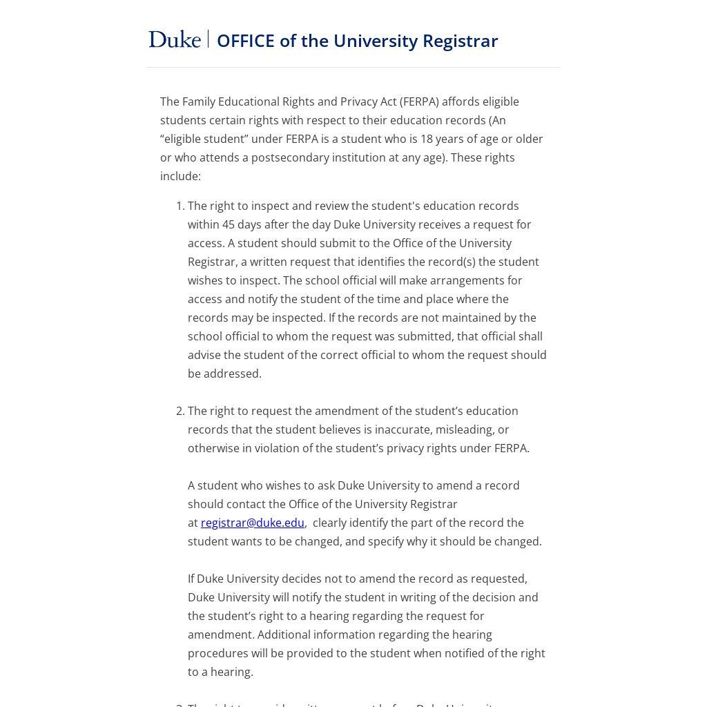A student who wishes to ask Duke University to amend a record should contact the Office of the University Registrar at registrar@duke.edu, clearly identify the part of the record the student wants to be changed, and specify why it should be changed.