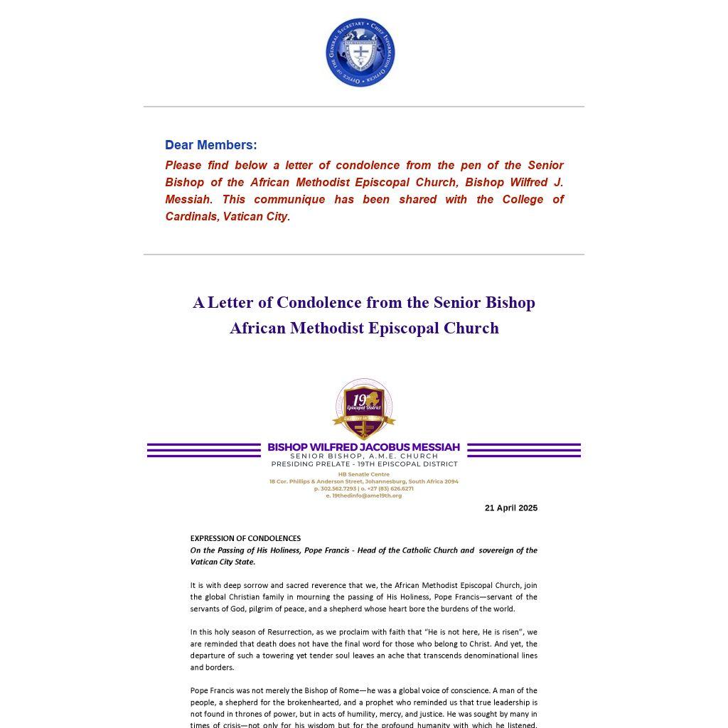 Please find below a letter of condolence from the pen of the Senior Bishop of the African Methodist Episcopal Church, Bishop Wilfred J. Messiah. This communique has been shared with the College of Cardinals, Vatican City.