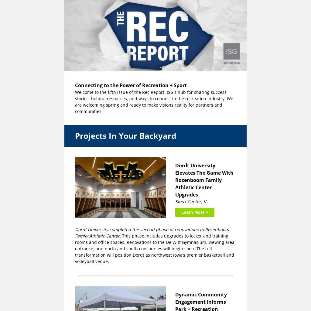 Welcome to the fifth issue of the Rec Report, ISG's hub for sharing success stories, helpful resources, and ways to connect in the recreation industry. We are welcoming spring and ready to make visions reality for partners and communities.