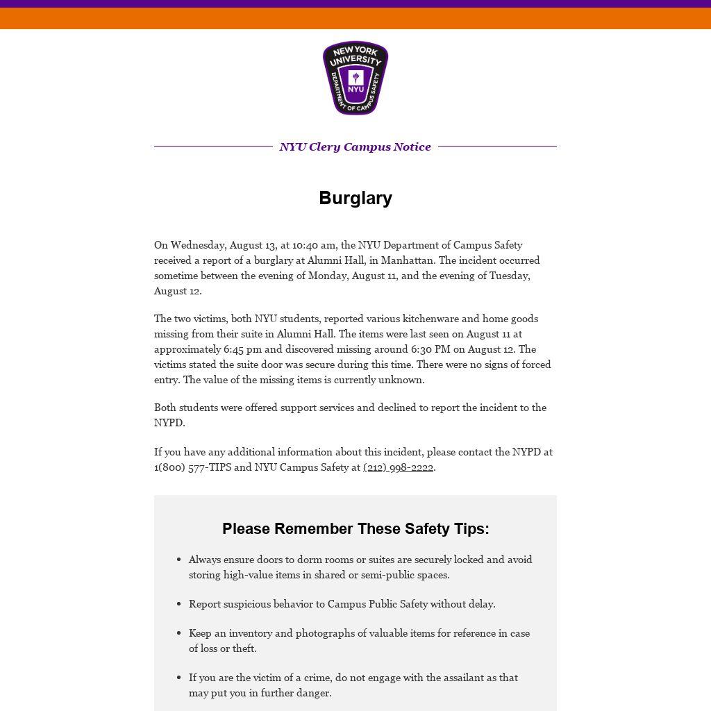 On Wednesday, August 13, at 10:40 am, the NYU Department of Campus Safety received a report of a burglary at Alumni Hall, in Manhattan. The incident occurred sometime between the evening of Monday, August 11, and the evening of Tuesday, August 12.