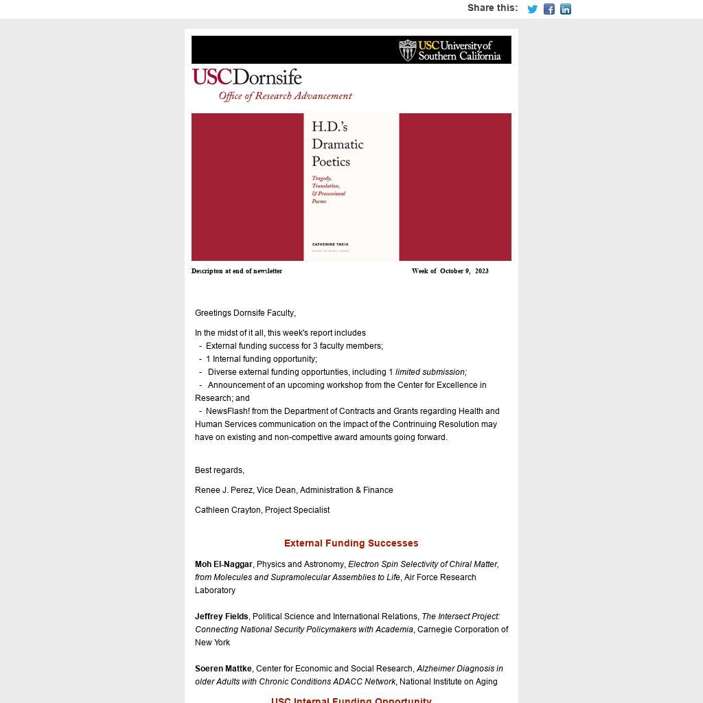 In the midst of it all, this week's report includes - External funding success for 3 faculty members; - 1 Internal funding opportunity; - Diverse external funding opportunties, including 1 limited submission; - Announcement of an upcoming workshop from the Center for Excellence in Research; and - NewsFlash! from the Department of Contracts and Grants regarding Health and Human Services communication on the impact of the Contrinuing Resolution may have on existing and non-compettive award amounts going forward.