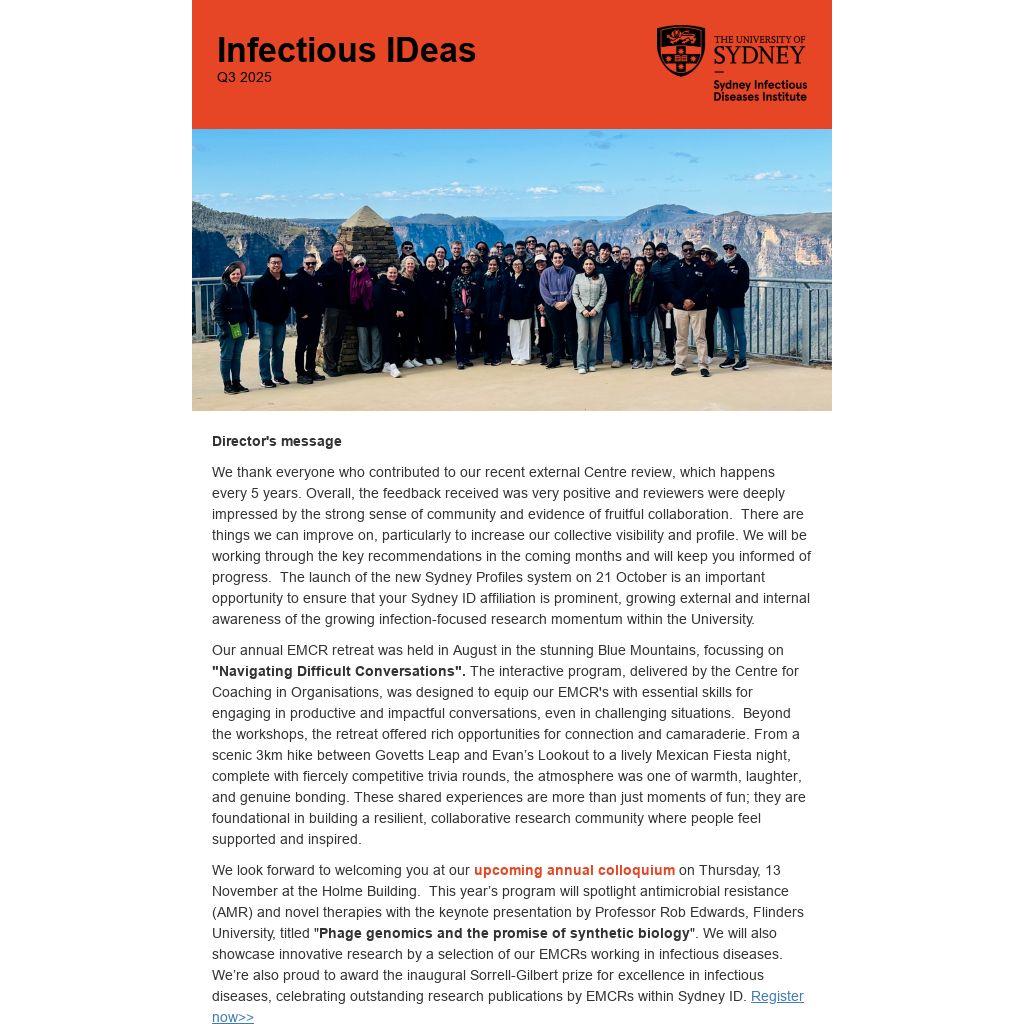 We thank everyone who contributed to our recent external Centre review, which happens every 5 years. Overall, the feedback received was very positive and reviewers were deeply impressed by the strong sense of community and evidence of fruitful collaboration. There are things we can improve on, particularly to increase our collective visibility and profile. We will be working through the key recommendations in the coming months and will keep you informed of progress. The launch of the new Sydney Profiles system on 21 October is an important opportunity to ensure that your Sydney ID affiliation is prominent, growing external and internal awareness of the growing infection-focused research momentum within the University.