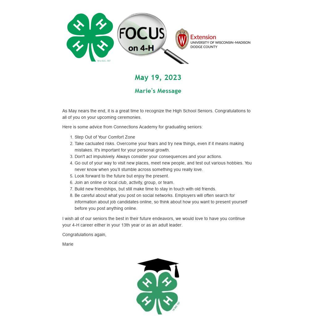 I wish all of our seniors the best in their future endeavors, we would love to have you continue your 4-H career either in your 13th year or as an adult leader.