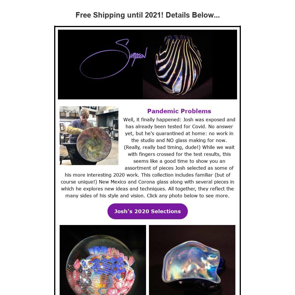 Well, it finally happened: Josh was exposed and has already been tested for Covid. No answer yet, but he's quarantined at home: no work in the studio and NO glass making for now. (Really, really bad timing, dude!) While we wait with fingers crossed for the test results, this seems like a good time to show you an assortment of pieces Josh selected as some of his more interesting 2020 work. This collection includes familiar (but of course unique!) New Mexico and Corona glass along with several pieces in which he explores new ideas and techniques. All together, they reflect the many sides of his style and vision. Click any photo below to see more.