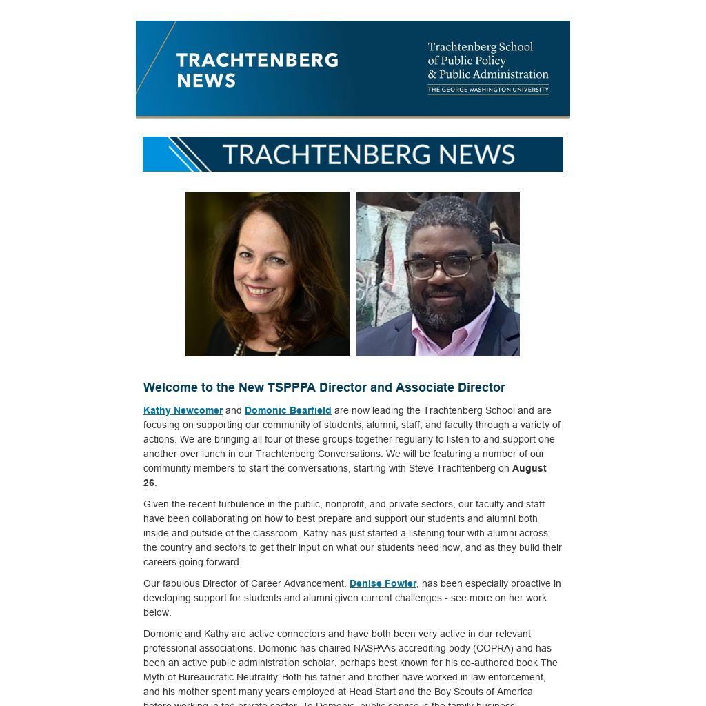 Kathy Newcomer and Domonic Bearfield are now leading the Trachtenberg School and are focusing on supporting our community of students, alumni, staff, and faculty through a variety of actions. We are bringing all four of these groups together regularly to listen to and support one another over lunch in our Trachtenberg Conversations. We will be featuring a number of our community members to start the conversations, starting with Steve Trachtenberg on August 26.
