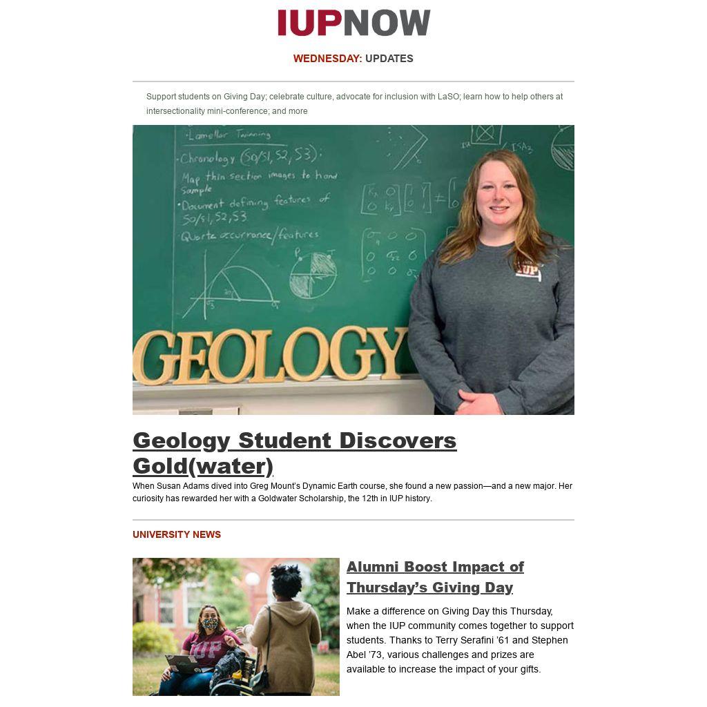 Distributed to IUP employees and students four days a week, IUP Now is the official newsletter of Indiana University of Pennsylvania. It features news from across the IUP website, compiled by the Division of Marketing and Communications. Find out how to get your news and events in IUP Now.