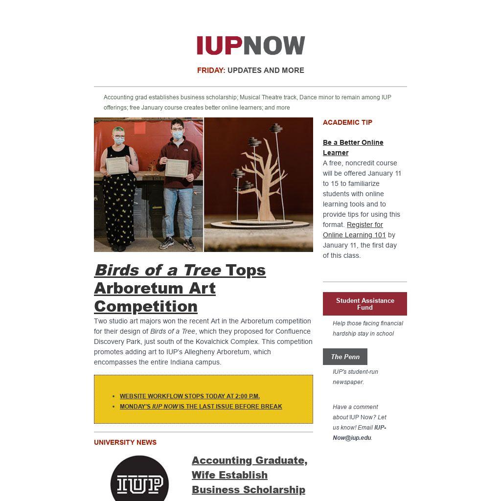 Distributed to IUP employees and students four days a week, IUP Now is the official newsletter of Indiana University of Pennsylvania. It features news from across the IUP website, compiled by the Division of Marketing and Communications. Find out how to get your news and events in IUP Now.