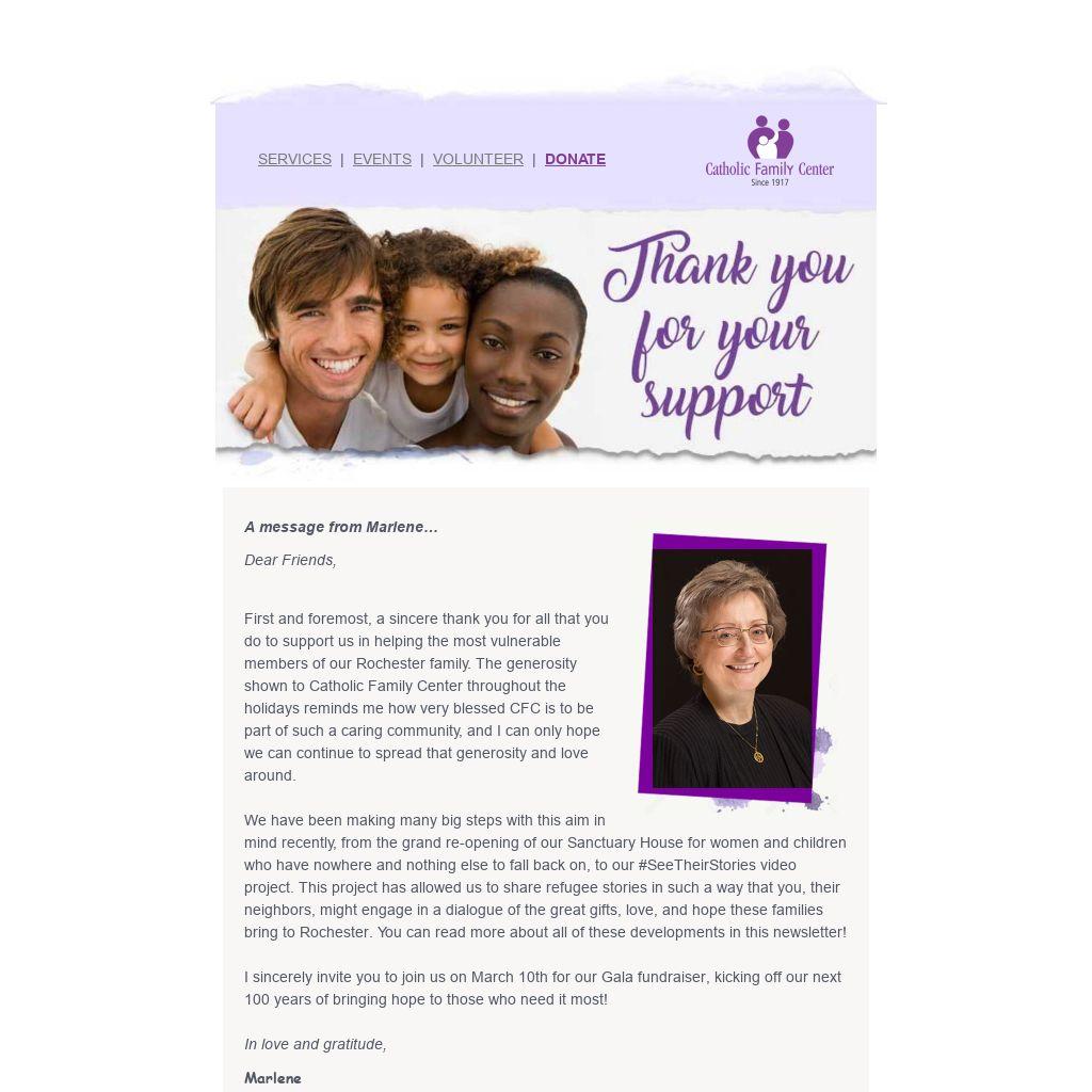 First and foremost, a sincere thank you for all that you do to support us in helping the most vulnerable members of our Rochester family. The generosity shown to Catholic Family Center throughout the holidays reminds me how very blessed CFC is to be part of such a caring community, and I can only hope we can continue to spread that generosity and love around.