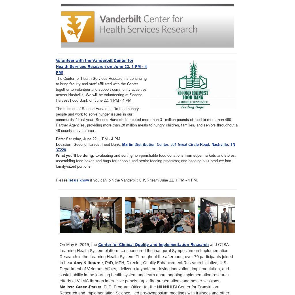 The Center for Health Services Research is continuing to bring faculty and staff affiliated with the Center together to volunteer and support community activities across Nashville. We will be volunteering at Second Harvest Food Bank on June 22, 1 PM - 4 PM.