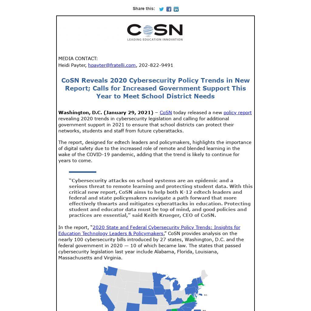 “Cybersecurity attacks on school systems are an epidemic and a serious threat to remote learning and protecting student data. With this critical new report, CoSN aims to help both K-12 edtech leaders and federal and state policymakers navigate a path forward that more effectively thwarts and mitigates cyberattacks in education. Protecting student and educator data must be top of mind, and good policies and practices are essential,” said Keith Krueger, CEO of CoSN.