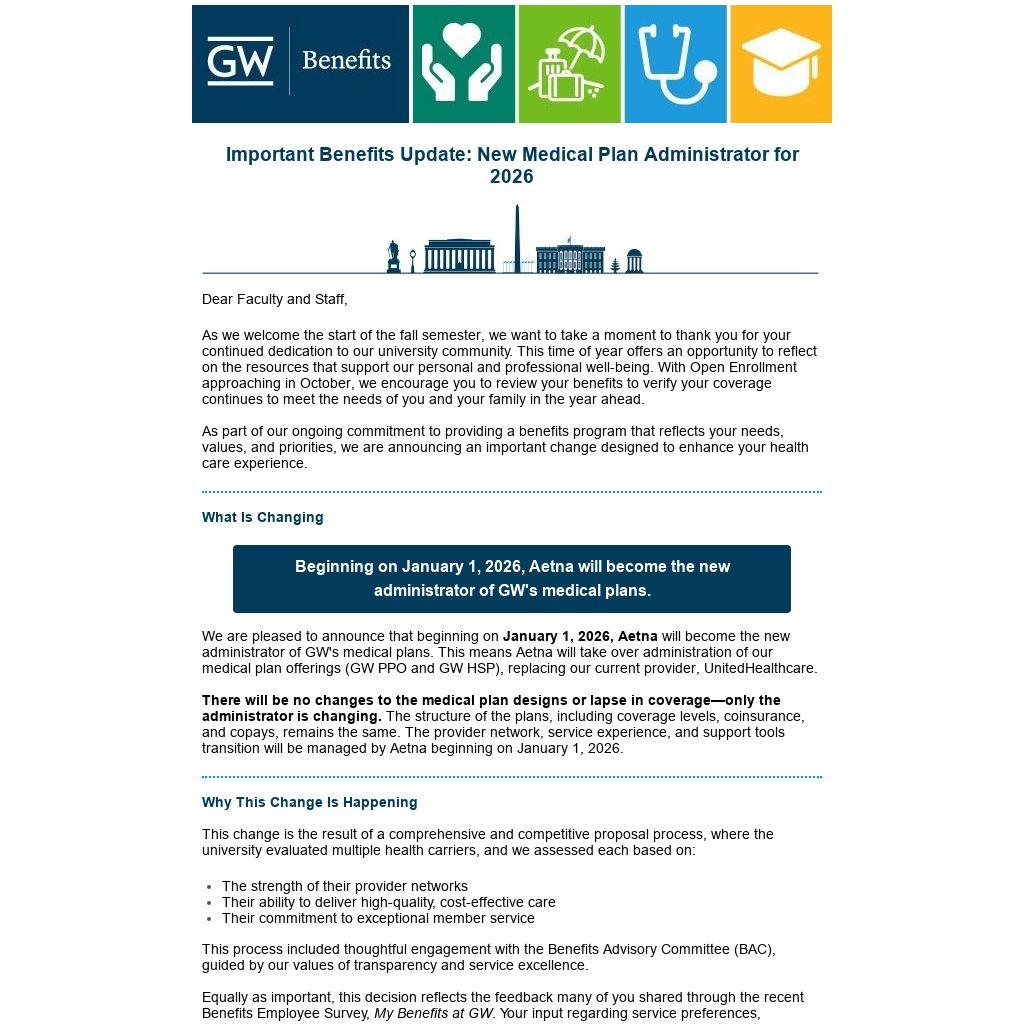 Equally as important, this decision reflects the feedback many of you shared through the recent Benefits Employee Survey, My Benefits at GW. Your input regarding service preferences, participant experience, and health care priorities played a key role in shaping this transition outcome. We believe that the change to Aetna is well-positioned to deliver a more responsive, supportive, and streamlined health care experience aligned with your expectations.
