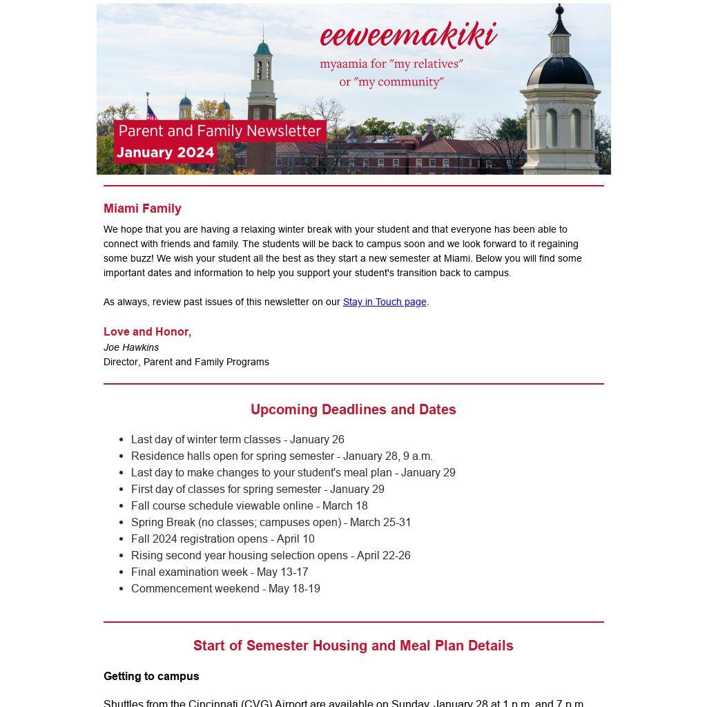 We hope that you are having a relaxing winter break with your student and that everyone has been able to connect with friends and family. The students will be back to campus soon and we look forward to it regaining some buzz! We wish your student all the best as they start a new semester at Miami. Below you will find some important dates and information to help you support your student's transition back to campus.