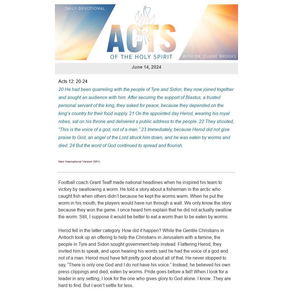 Herod fell in the latter category. How did it happen? While the Gentile Christians in Antioch took up an offering to help the Christians in Jerusalem with a famine, the people in Tyre and Sidon sought government help instead. Flattering Herod, they invited him to speak, and upon hearing his words said he had the voice of a god and not of a man. Herod must have felt pretty good about all of that. He never stopped to say, “There is only one God and I do not have his voice.” Instead, he believed his own press clippings and died, eaten by worms. Pride goes before a fall! When I look for a leader in any setting, I look for the one who gives glory to God alone. I know. They are hard to find. But I won’t settle for less.