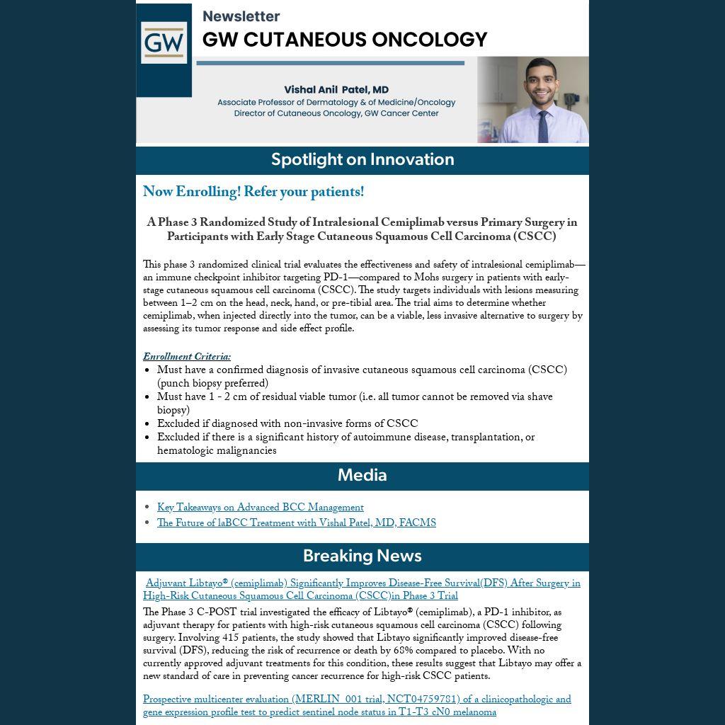For surgical or cutaneous oncology referrals, please email skincancer@mfa.gwu.edu with relevant patient information (PHI secure). For patient inquires or appointments, please call Allison Moradel, Cutaneous Oncology program coordinator, at 202-741-2829.