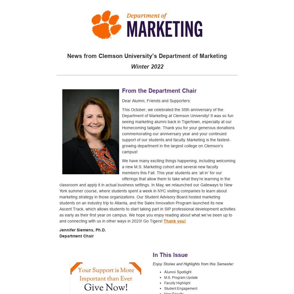 We have many exciting things happening, including welcoming a new M.S. Marketing cohort and several new faculty members this Fall. This year students are ‘all in’ for our offerings that allow them to take what they’re learning in the classroom and apply it in actual business settings. In May, we relaunched our Gateways to New York summer course, where students spent a week in NYC visiting companies to learn about marketing strategy in those organizations. Our Student Advisory Board hosted marketing students on an industry trip to Atlanta, and the Sales Innovation Program launched its new Ascent Track, which allows students to start taking part in SIP professional development activities as early as their first year on campus. We hope you enjoy reading about what we’ve been up to and connecting with us in other ways in 2023! Go Tigers! Thank you!