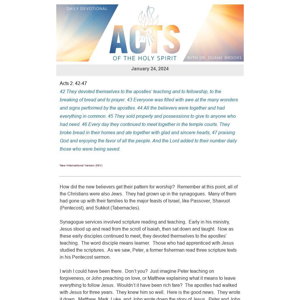 Synagogue services involved scripture reading and teaching. Early in his ministry, Jesus stood up and read from the scroll of Isaiah, then sat down and taught. Now as these early disciples continued to meet, they devoted themselves to the apostles’ teaching. The word disciple means learner. Those who had apprenticed with Jesus studied the scriptures. As we saw, Peter, a former fisherman read three scripture texts in his Pentecost sermon.