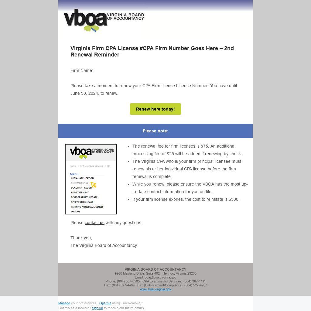 Virginia Firm CPA License #CPA Firm Number Goes Here – 2nd Renewal Reminder