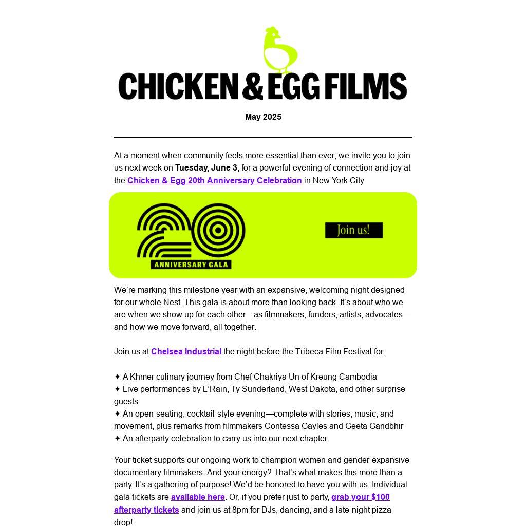 At a moment when community feels more essential than ever, we invite you to join us next week on Tuesday, June 3, for a powerful evening of connection and joy at the Chicken & Egg 20th Anniversary Celebration in New York City.