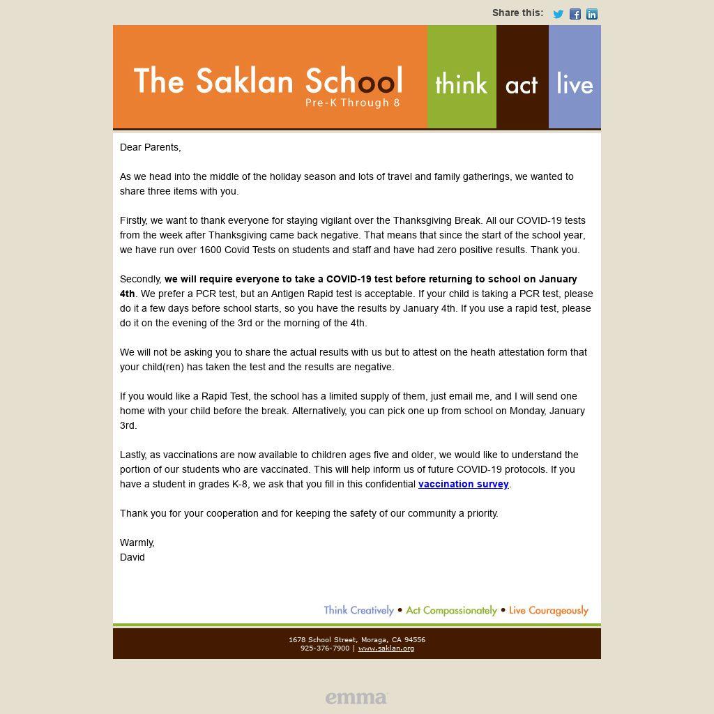 Secondly, we will require everyone to take a COVID-19 test before returning to school on January 4th. We prefer a PCR test, but an Antigen Rapid test is acceptable. If your child is taking a PCR test, please do it a few days before school starts, so you have the results by January 4th. If you use a rapid test, please do it on the evening of the 3rd or the morning of the 4th.