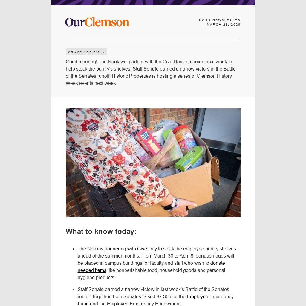 Good morning! The Nook will partner with the Give Day campaign next week to help stock the pantry's shelves. Staff Senate earned a narrow victory in the Battle of the Senates runoff; Historic Properties is hosting a series of Clemson History Week events next week.