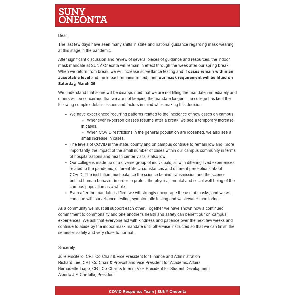 After significant discussion and review of several pieces of guidance and resources, the indoor mask mandate at SUNY Oneonta will remain in effect through the week after our spring break. When we return from break, we will increase surveillance testing and if cases remain within an acceptable level and the impact remains limited, then our mask requirement will be lifted on Saturday, March 26.