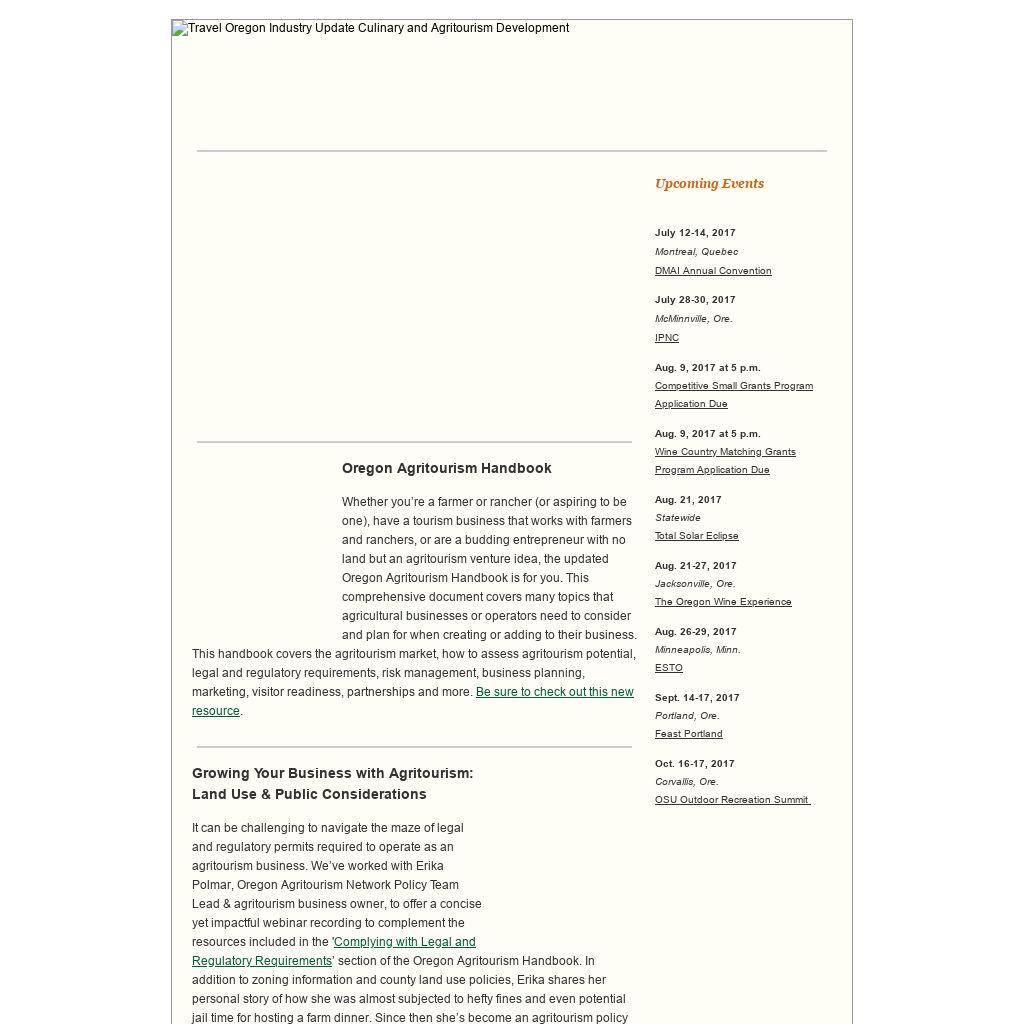 Whether you’re a farmer or rancher (or aspiring to be one), have a tourism business that works with farmers and ranchers, or are a budding entrepreneur with no land but an agritourism venture idea, the updated Oregon Agritourism Handbook is for you. This comprehensive document covers many topics that agricultural businesses or operators need to consider and plan for when creating or adding to their business. This handbook covers the agritourism market, how to assess agritourism potential, legal and regulatory requirements, risk management, business planning, marketing, visitor readiness, partnerships and more. Be sure to check out this new resource.