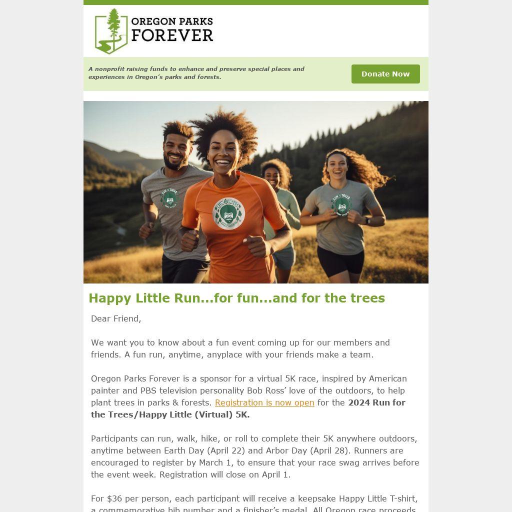 Oregon Parks Forever is a sponsor for a virtual 5K race, inspired by American painter and PBS television personality Bob Ross’ love of the outdoors, to help plant trees in parks & forests. Registration is now open for the 2024 Run for the Trees/Happy Little (Virtual) 5K.
