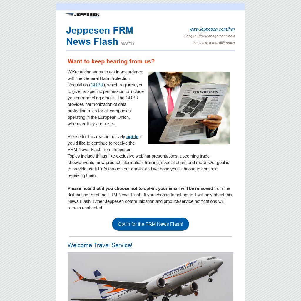 Please for this reason actively opt-in if you'd like to continue to receive the FRM News Flash from Jeppesen. Topics include things like exclusive webinar presentations, upcoming trade shows/events, new product information, training, special offers and more. Our goal is to provide useful info through our emails and we hope you'll choose to continue receiving them.