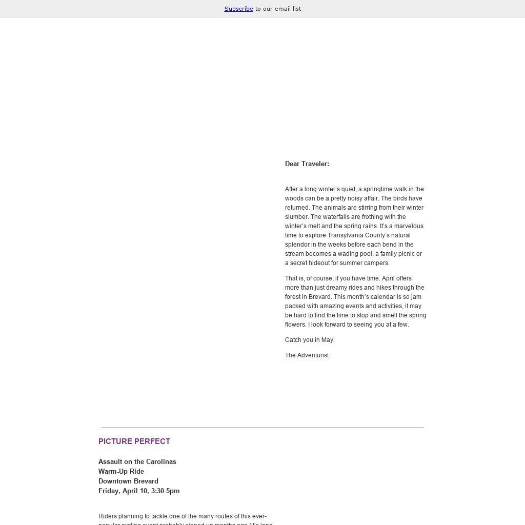 That is, of course, if you have time. April offers more than just dreamy rides and hikes through the forest in Brevard. This month’s calendar is so jam packed with amazing events and activities, it may be hard to find the time to stop and smell the spring flowers. I look forward to seeing you at a few.