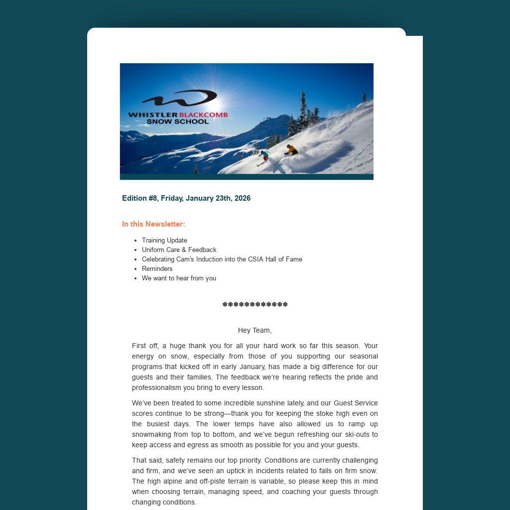 First off, a huge thank you for all your hard work so far this season. Your energy on snow, especially from those of you supporting our seasonal programs that kicked off in early January, has made a big difference for our guests and their families. The feedback we’re hearing reflects the pride and professionalism you bring to every lesson.