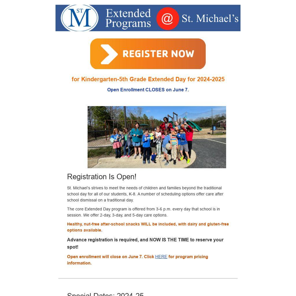 St. Michael’s strives to meet the needs of children and families beyond the traditional school day for all of our students, K-8. A number of scheduling options offer care after school dismissal on a traditional day.