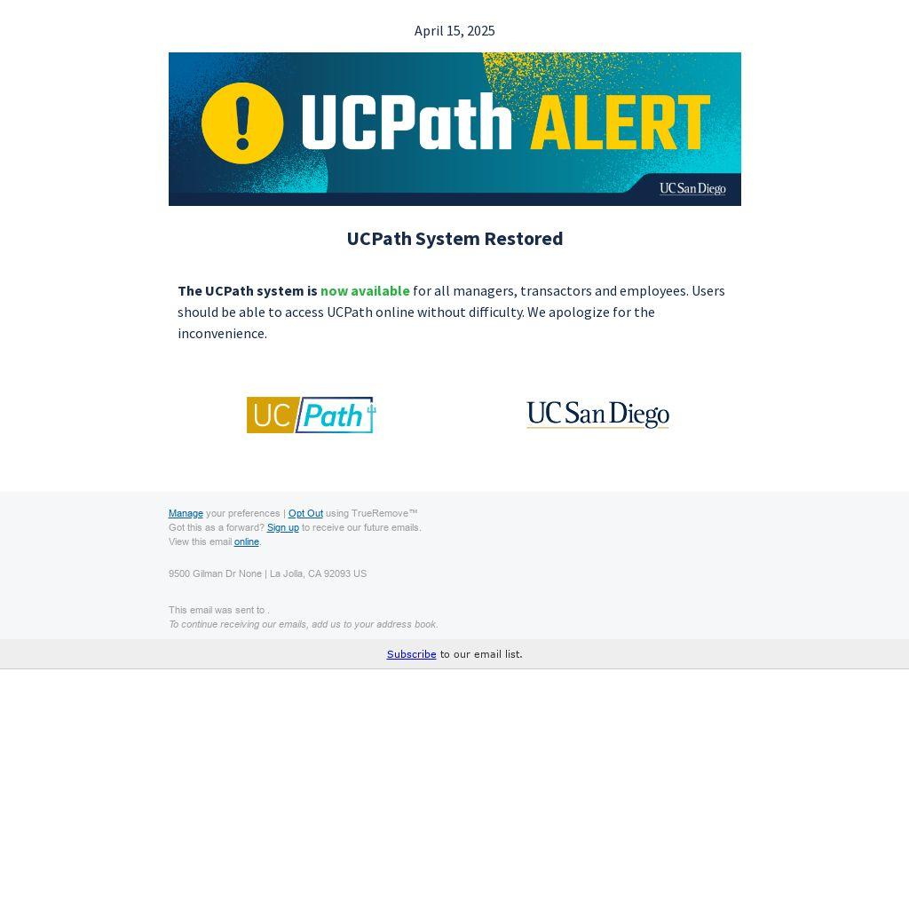 The UCPath system is now available for all managers, transactors and employees. Users should be able to access UCPath online without difficulty. We apologize for the inconvenience.