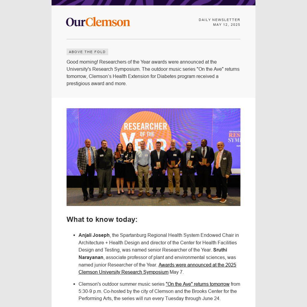 Good morning! Researchers of the Year awards were announced at the University's Research Symposium. The outdoor music series "On the Ave" returns tomorrow, Clemson’s Health Extension for Diabetes program received a prestigious award and more.